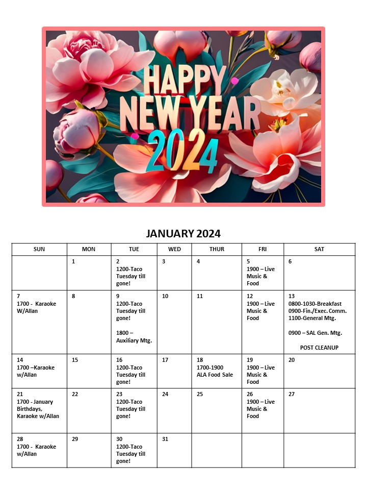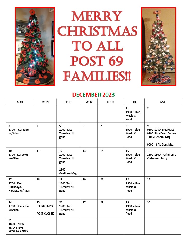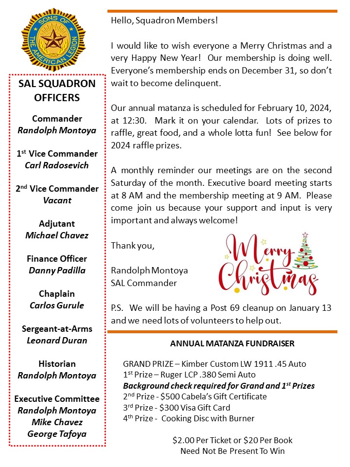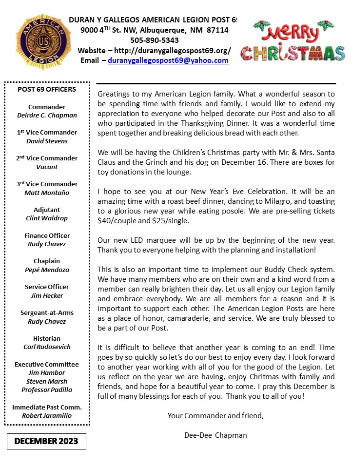 Photo Galleries December 2023 Newsletter Patriotic Brief Case Post 69 Legion Riders January 2024 Marquee 2024 New Year's Eve Party 2023 February 2024 March 2024 April 2024 Newsletter February 2025 Newsletter April 2023 Newsletter August 2023 Newsletter December 2023 Newsletter Hall Photos July Newsletter June 2023 Newsletter May 2023 Newsletter Misc 2023 Newsletter National Commander's Visit - April November 2023 Newsletter October 2023 Newsletter Post By Laws Post Officers September 2023 Newsletter