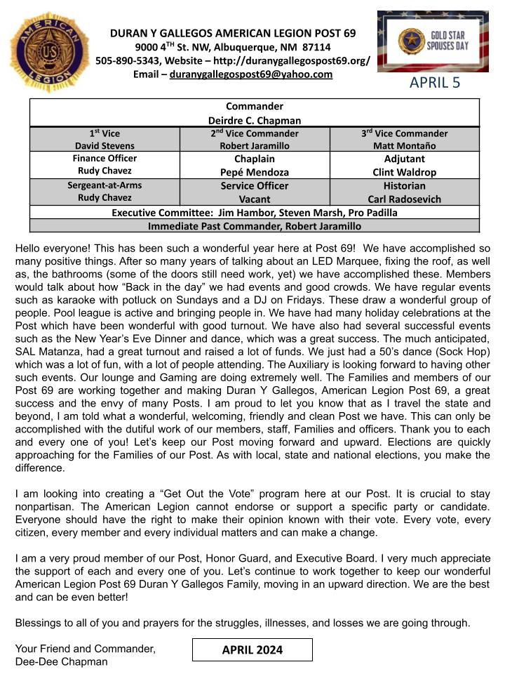 Photo Galleries April 2024 Newsletter Patriotic Brief Case Post 69 Legion Riders January 2024 Marquee 2024 New Year's Eve Party 2023 February 2024 March 2024 April 2024 Newsletter February 2025 Newsletter April 2023 Newsletter August 2023 Newsletter December 2023 Newsletter Hall Photos July Newsletter June 2023 Newsletter May 2023 Newsletter Misc 2023 Newsletter National Commander's Visit - April November 2023 Newsletter October 2023 Newsletter Post By Laws Post Officers September 2023 Newsletter